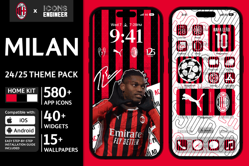 Inspired by the Authentic AC Milan 24/25 Home Kit, this pack features iconic app icons, widgets, and wallpapers to let your phone shine with the glory of the Rossoneri.