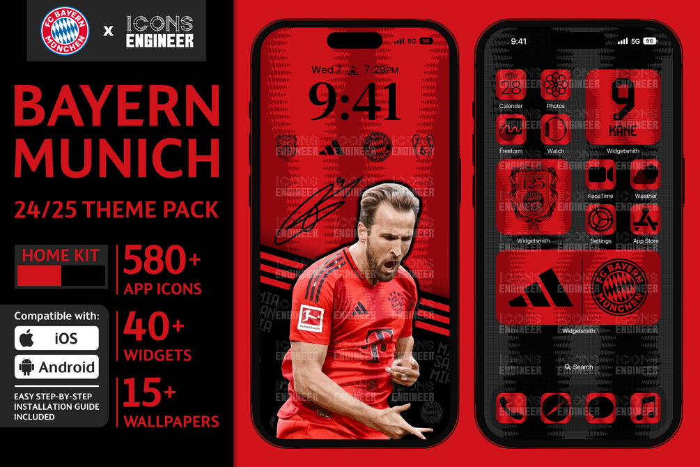 Inspired by the Authentic FC Bayern Munich 24/25 Home Kit, this pack features iconic app icons, widgets, and wallpapers to let your phone shine with the glory of the Bavarians.
