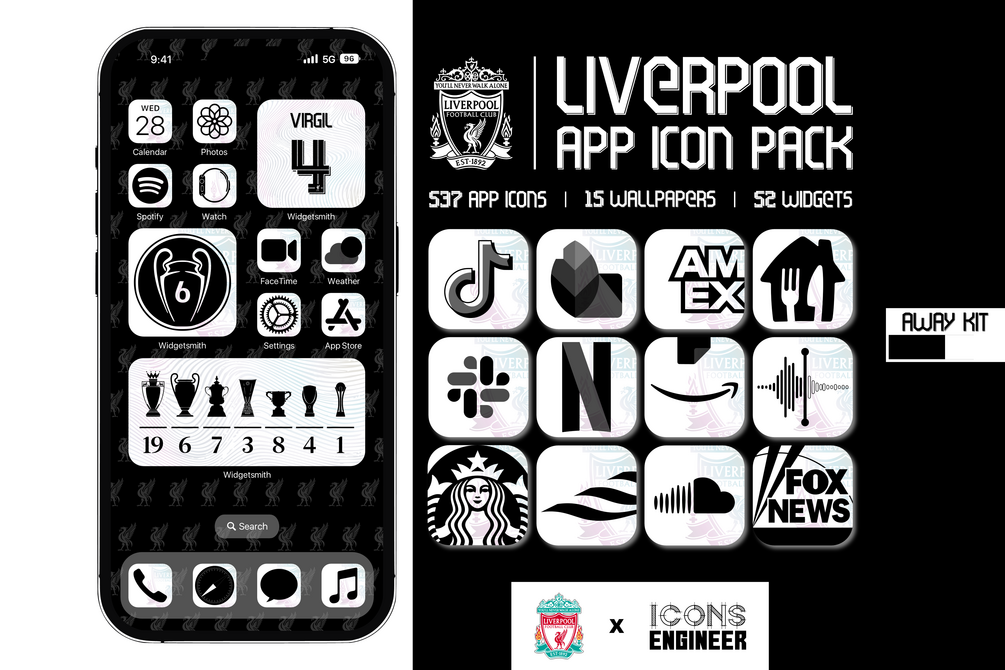 This pack includes all the most emblematic app icons, widgets, and wallpapers, inspired by the Authentic Liverpool FC 22/23 Away Kit to make your phone shine with the Reds' glory.