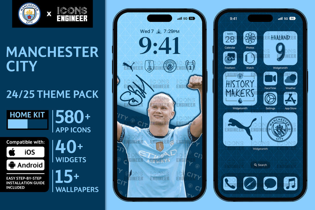 Inspired by the Authentic Manchester City 24/25 Home Kit, this pack features iconic app icons, widgets, and wallpapers to let your phone shine with the glory of Cityzens.