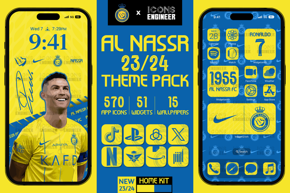 This pack includes all the most emblematic app icons, widgets, and wallpapers. Inspired by the Authentic Al-Nassr 23/24 Home Kit to make your phone shine with the Al Alami glory.