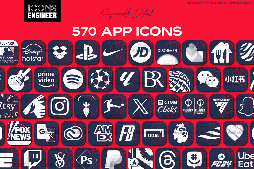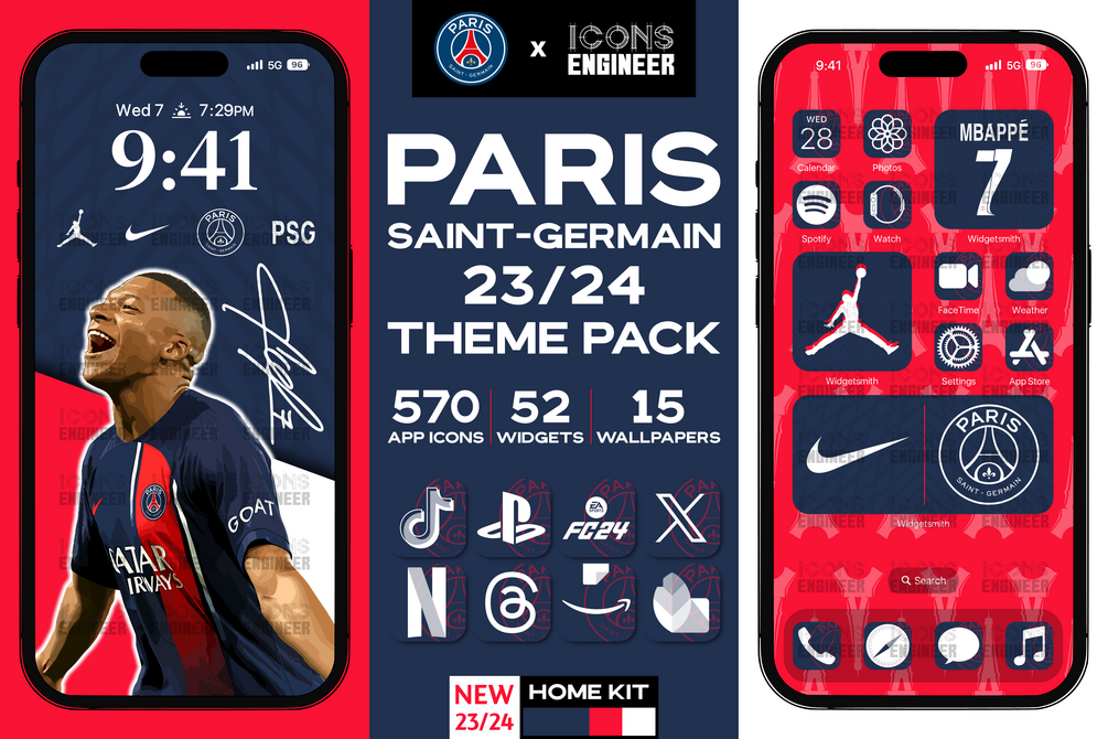 This pack includes all the most emblematic app icons, widgets, and wallpapers. Inspired by the Authentic Paris Saint-Germain 23/24 Home Kit to make your phone shine with the PSG glory.