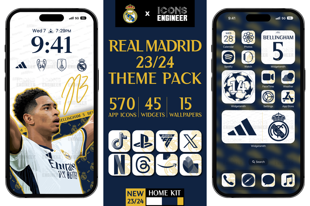 This pack includes all the most emblematic app icons, widgets, and wallpapers, inspired by the glorious Real Madrid 23/24 Home Kit to make your phone shine with Real Madrid pride.